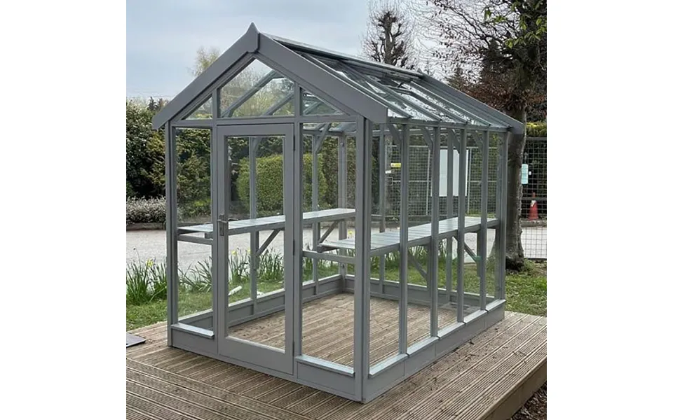 Stylishly designed, beautifully built, and with professional installation included in the price, the 6'3 x 6'4 coppice ashdown apex painted wooden greenhouse 1.91M x 1.93M is sure to appeal to green-fingered experts and novice gardeners alike.A premium painted greenhouseexpertly handcrafted from 12mm wooden cladding, on a robust 44mm r4c frame, this premium greenhouse is as strong as it is stylish. Pressure treated to prevent rot, the wood comes with a stylish grey finish, which is sure to complement the rest of your garden beautifully.The extensive glazing means natural light floods into the greenhouse to benefit your plants. It is made from 3mm toughened glass just want you need to withstand the rigours of a busy, family-orientated garden.Entering the glasshouseyou can easily access this glasshouse via a right-hand-hinged, toughened-glass door, which is fitted with chrome handles and hinges for that extra touch of class. This door also includes a 3-lever mortice lock, so rest assured that your valuable tools and invaluable plants will remain completely safe from unwanted attention.Other greenhouse key featuresonce inside, you'll find the 2 greenhouse shelves provide ample space for potting and displaying your plants. They are supplied with brackets, so easily fixed to the greenhouse frame.An opening vent is positioned on each side of the apex roof, helping you regulate the temperature inside the greenhouse to optimise growing conditions.Please be advised that this green...