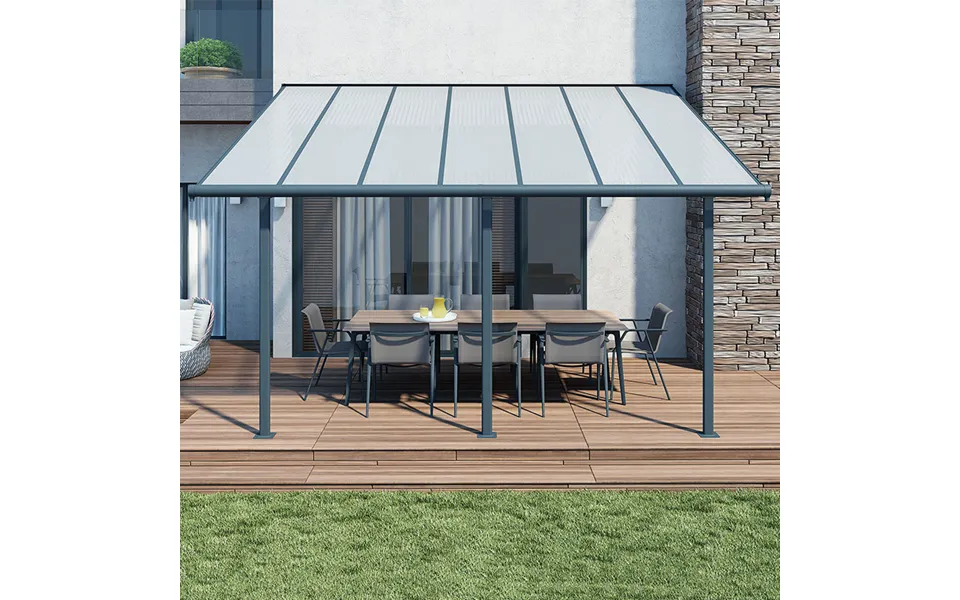 Wouldn't it be wonderful to relax in your garden, sheltered from showers and shaded from the sun well, if you'd like to spend more time outdoors and don't want the weather spoiling your fun, buy the 10x14 palram canopia sierra grey patio cover 3m x 4.25M today.Expertly built from 6mm twin-wall polycarbonate roof panels, this premium garden awning is near-unbreakable, completely shatterproof and fully uv-protected. This means it will maintain its attractive appearance in your garden and never fracture, discolour or fade. These high-impact polycarbonate panels allow 80% light transmission and block harmful uv rays, ensuring you enjoy a safe and comfortable environment in which to relax in your garden.This polycarbonate patio cover also features a heavy-duty, powder-coated aluminium frame, 3 supporting legs and laser-cut galvanised steel connectors, all of which are robust, durable and impervious to rust.Wind resistant to 90km&sol hr 56ml&sol hr and snow-load tested to 120kg&sol m 24.6Lbs&sol ft , this superior patio awning offers outstanding weatherproof protection for your garden furniture, whatever nature throws at it, while the screw-free sliding panel installation system eliminates any risk of leakage.An integral guttering system, including adjustable gutter heads, not only facilitates effective rainwater run-off, it offers you a free and sustainable source of water for your garden plants too. To top it all, the whole garden furniture cover is completely maintenance-fre...