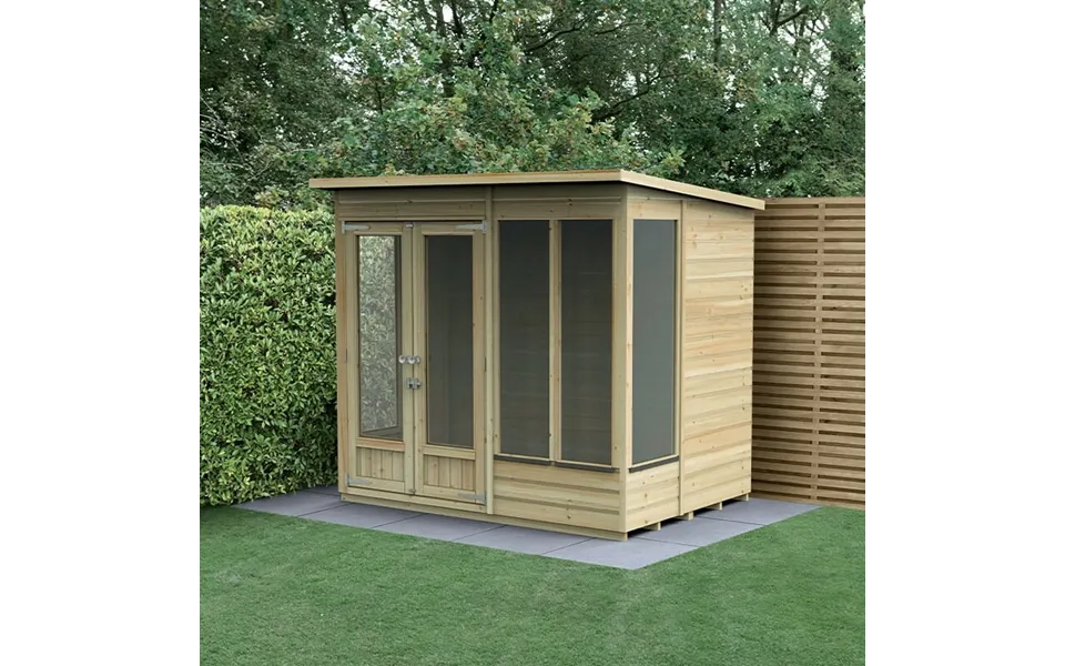 Expertly crafted to stand the test of time, and with a quintessentially english charm, forest beckwood summerhouses are the type of garden buildings dreams are made of. Boasting premium shiplap cladding, pressure-treated wood and an extraordinary 25-year guarantee, they simply ooze sophistication and class. This particular model is the 7 x 5 double door pent summer house 2.26M x 1.7M , so provides you with an idyllic space in which to relax in the garden, come rain or shine.A fully-modular premium summer housebeautifully built here, in great britain, this garden summerhouse features a fully-modular design. This means it's delivered in smaller sections of interchangeable panels, but you get more overall wood, so you'll find it much easier to assemble and far stronger than other wooden summerhouses. This fully-modular design also allows you a market-leading choice of door&sol window placements, helping you customise the summerhouse to your exact requirements.The walls are constructed from 12mm shiplap tongue and groove cladding, on a 28mm x 28mm frame, making for an incredibly robust structure. This tightly-interlocking design also provides weather-beating performance and increases durability, while shiplap's scalloped profile enhances aesthetic appeal. A sumptuous smooth-planed finish perfectly rounds off the summerhouse's exceptionally attractive appearance.T & g floor and weatherproof roof coveringmade from superior 12mm tongue and groove boards, the floor is perfectly e...