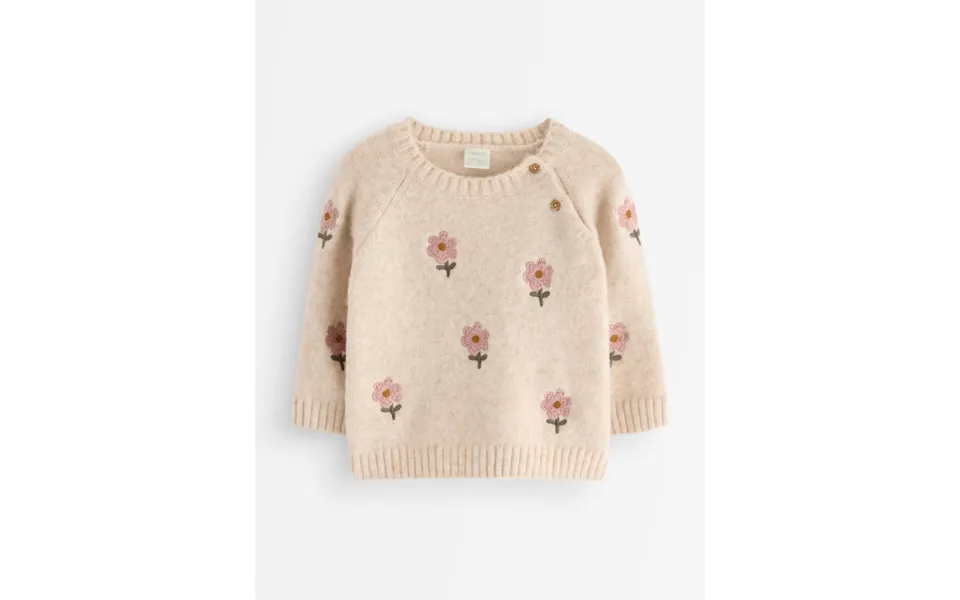 Soft knitted jumper with embroidered flowers and button opening at front neck.