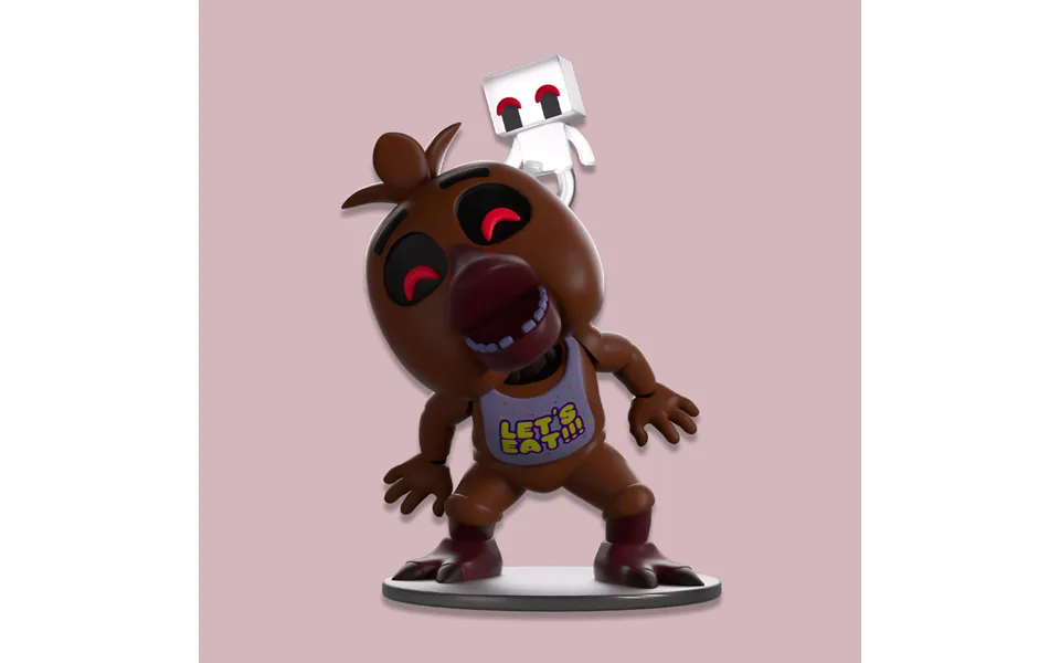 With her knees bent and leaning to the side, chica stands at 4.7 Inches tall, her arms curving backwards. A wail escapes from her bright orange beak, while bright pink pupils glow from within dark sockets. Atop her head rest a trio of feathers, and above her, a clear ghost hovers. She wears a simple white 'let's eat ' bib around her neck, and her yellow segmented animatronic body leads down to orange claws. The exterior of the packaging depicts chica reaching up towards a security camera, accompanied by a small swirling ghost around her body. Inside, the same ghost is seen flying through the vent of the security room. The protective sleeve offers a close-up of the pizzeria's wall and showcases chica's figure through a large clear window at the front. This collectible ships in a matte, embossed, protective outer sleeve and a custom-sized plastic protector, ensuring utmost safety during shipping. Youtooz collaborated closely with fnaf fanverse game creator kane carter in developing the haunted collection, ensuring authenticity and meticulous attention to detail. This exclusive chica figure captures the eerie essence of the popular game series, making it a prized addition to any fan's collection.