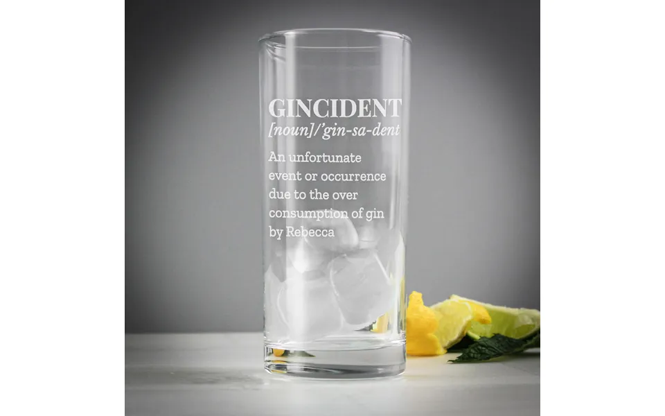 Gin just speaks to some people. But, often it tells them that they can dance, that they’re really funny, or that they’re charismatic. And, what happens when people listen to gin ask this personalised gincident highball glass at first glance, this glass looks like an ordinary, if high quality, highball glass. It has a message printed on it defining the term gincident’, which is essentially a bad thing that happened due to the ginappropriate consumption of smiley juice but, here comes the twist of lemon being customisable, you can add the name of the person who tends to have the most gincidents due to their gindecent relationship with good ol’ mother’s ruin you can personalise the glass with up to 12 characters and it’ll come neatly packed in a folding gift box, making it a brilliant gift for any event the text before the personalised name reads: gincident noun ’gin-sa-dent’ an unfortunate event or occurrence due to the over consumption of gin by name . Don’t let gindecision get in the way or maybe do we don’t know if it’s a good or bad thing in this case. But we do know that if you’re a gin lover, or you happen to know one, you need this personalised gincident hi ball glass are you gin or out personalisation: name 12 characters max. Please note: this item will be personalised exactly as you have written so please double check spelling, punctuation and use of capital letters personalised products can only be returned if they are faulty do not include accents and special sym...