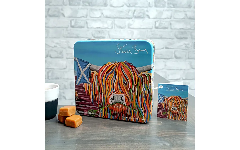 Treat yourself or a loved one to the delightful flavours of the hamish mccoo malt whisky fudge tin. Featuring steven brown's iconic, multi-coloured cow, hamish mccoo, this beautifully decorated tin is a true work of art. Inside, you'll find gardiners of scotland's traditional, handmade malt whisky fudge, offering a luxurious blend of smooth, creamy fudge with a rich whisky undertone that melts in your mouth. The indulgent malt whisky fudge is soft and full of flavour, making it a perfect gift for whisky lovers or anyone with a sweet tooth. Presented in a stunning art tin with a gift tag, this makes a thoughtful and unique present for special occasions, or a delicious treat to enjoy yourself. Whether you’re gifting it to a loved one or treating yourself to something indulgent, the hamish mccoo malt whisky fudge tin combines exquisite taste with beautiful artwork, offering the ultimate sweet experience.