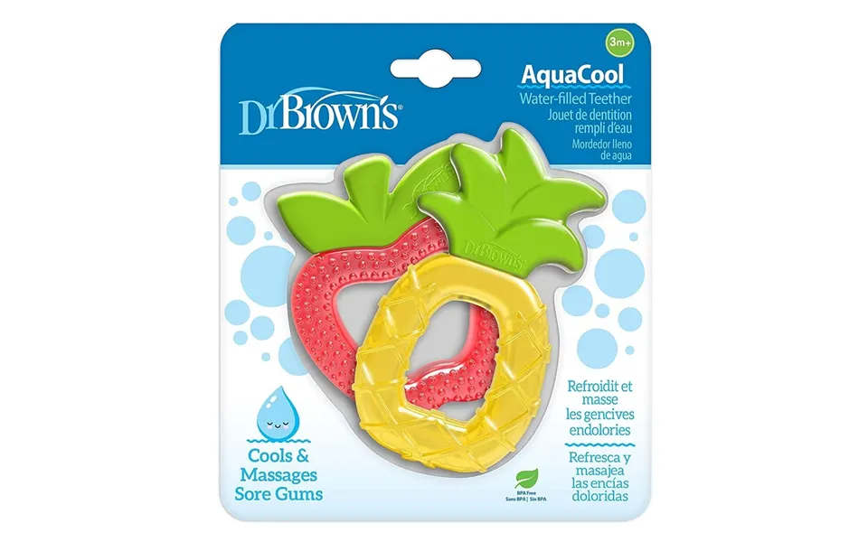 Quick cooling relief for sore gums and teeth dr. Brown’s aquacool water-filled teether cools and soothes teething baby’s gums. Filled with water instead of gel, the cooling teether offers safe soothing for all areas of baby’s mouth. Bright colors and whimsically designed pineapple and apple shapes keep baby engaged and stimulate the senses. The soft silicone material provides comfort to put baby at ease. This refrigerator-safe water teether features solid leaves designed for little hands to comfortably hold even when cold. To clean, hand wash teething toy in warm, soapy water. Water-filled teether offers safe soothing for all areas of baby’s mouth. Baby teething toy can be placed in the refrigerator for cooling relief. Stimulates sensory motors skills and keeps baby engaged as they self-soothe bpa free 3 months