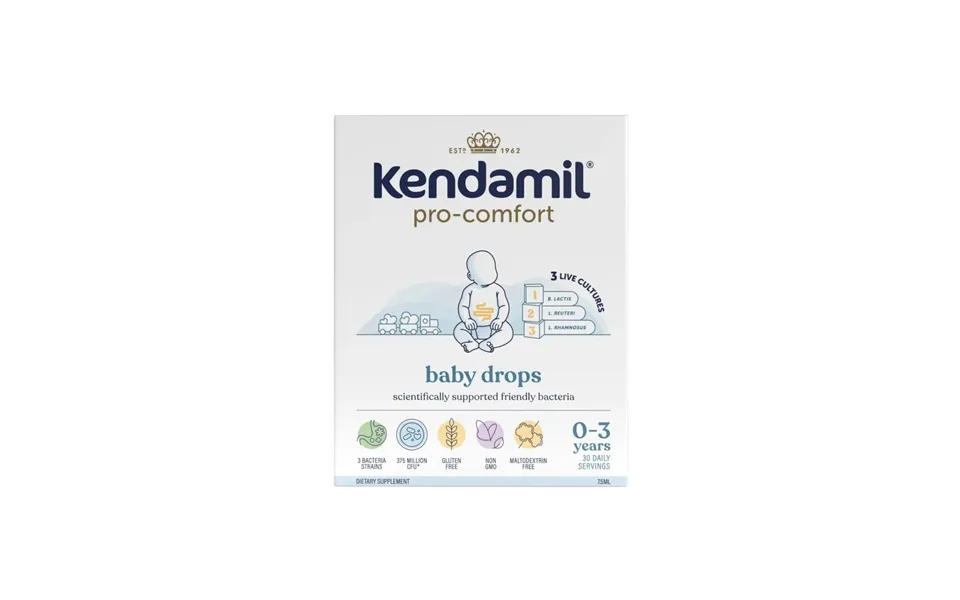Why buy me friendly bacteria for little tummies. Our kendamil pro-comfort baby drops are designed to support the development and balance of your little one’s gut microbiome. Our drops uniquely contain 3 friendly bacteria strains bifidobacterium lactis, lactobacillus reuteri and lactobacillus rhamnosus with 375 million live bacteria per serving. At kendamil we don’t do unnecessary ingredients, so you’ll find no artificial colours, sugars, gluten, maltodextrin or soy our drops are suitable from birth and are designed to work alongside breastfeeding or bottle feeding. All they need is 5 drops a day, administered with our easy to use pipette. One bottle is 7.5Ml and contains 30 days servings. Brand: kendamil product type: baby food product sub-type: finger food & snacks how to use store at room temperature or refrigerated. Keep away from sunlight. Once open use within 2 months. Step 1 shake bottle well until cloudy. Step 2 open the bottle, discarding the cap and replacing it with pipette. Step 3 administer 5 drops daily from the pipette either directly into the mouth, on a spoon, in a formula bottle or in breastmilk. Age: 0-3 years details: maltodextrin free: with no maltodextrin or added sugars 3 bacteria strains: with 3 unique bacteria strains 375 million live bacteria: designed to support little tummies gluten free: allergen free to support all dietary needs added fos : fos feed friendly bacteria