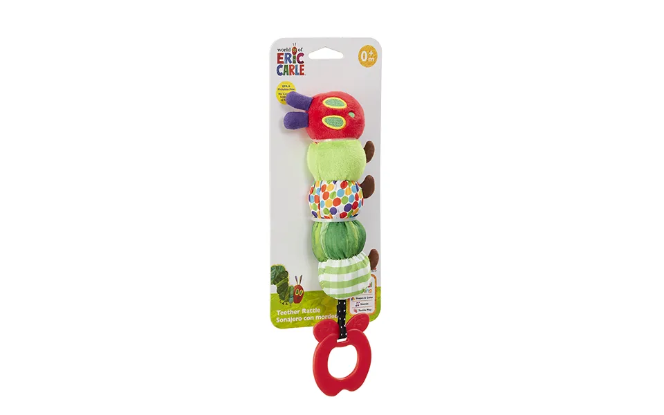 Keep babies of all ages entertained for hours with the fun, vibrant and colourful teether rattle from the very hungry caterpillar. This cute toy is made especially for little hands to hold and the very hungry caterpillar shaped rattle is the perfect gift for a first birthday, a first christmas or a christening gift, or as a new arrival present. Featuring the wonderful and ever popular very hungry caterpillar character from eric carle's classic tale. Early visual awareness is encouraged not only with the bright vibrant greens and blues of the very hungry caterpillar's body and its eye catching red head with yellow and green eyes and purple feelers. He has a soft green textured teether tail. The very hungry caterpillar teether rattle is the perfect story time companion for baby to hold whilst being read the timeless the very hungry caterpillar storybook.