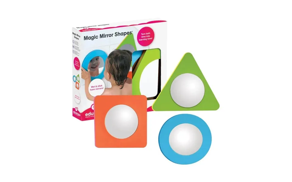Why buy me edushape magic mirrors: transform bath time into a playful learning experience this set of 3 mirrors square, triangle, and circle teaches basic geometric shapes and enhances colour recognition. The mirrors stick to wet surfaces with a splash of water, aiding motor skill development. Designed for easy removal and resistance to water and mould, these mirrors are a mess-free, educational delight for kids aged 12 months and up. No assembly is required, promoting hassle-free bath-time fun. Brand: edushape product type: bath equipment product sub-type: bath play time functionality: edushape magic mirrors add learning to bath-time fun geometric shapes stick to wet surfaces, aiding motor skills and shape recognition. Water and mould-resistant, these mess-free mirrors are perfect for kids aged 12 months and up, requiring no assembly for easy and engaging bath time. How to use simply splash a little water on edushape magic mirrors and watch them stick to smooth surfaces in the bath. Easy to apply and remove, these mirrors add learning and fun to bath time. Age: 12 months details: room type: bathroom shape: triangular, round, square product: dimensions 9.5 L x 2 w mounting type: wall mount