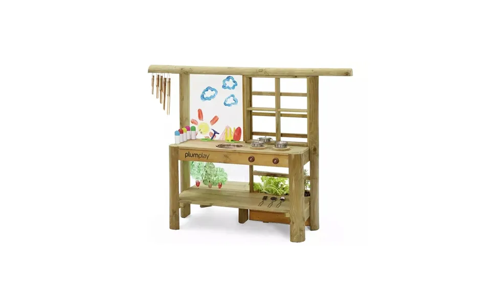 Why buy me with the plum discovery mud pie kitchen, little ones can explore both gardening and outdoor cooking fun made from fsc certified, sustainably sourced wood, this outdoor kitchen brings together natural materials and imaginative play. With wooden shelves, tinker pots, stylish kitchen accessories, a real sink bowl, and a planter with trellis for budding gardeners, it offers a playful and educational space all in one. The easy-clean painting screen and included colourful paint pens let children get creative while keeping the mess outside. Whether they’re baking muddy pies or planting their first seeds, this kitchen is the sweetest way to connect with nature and creativity at the same time brand: plum product type: outdoor toys product sub-type: outdoor fun & games recommended age: 3 years details: includes two tinker pots for storing paints, plants, or natural finds. Built-in mini planter with trellis helps children explore basic gardening skills. Sink-style bowl supports imaginative kitchen role play. Features an easy-clean painting screen designed for water-based paints. Colourful paint pens are included with the product. Bamboo wind chimes enhance sensory play through sound and movement. Made entirely from fsc certified, sustainably sourced timber. Free from bpa and toxic substances. Comes with a 12-month manufacturer’s warranty. Dimensions: l139 x w70 x h116 cm
