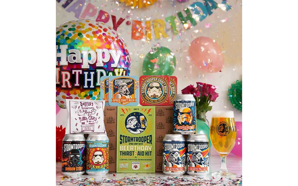 Not for sale to persons under the age of 18. Age verification checks will be performed during checkout. This item must be used responsibly and appropriately. How do you know stormtroopers love to party because they take so many shots so, if you’re looking for a birthday present that’s a party in a box, you can’t do better than this stormtrooper beerthday thirst aid kit unofficial stormtrooper merchandise, this beer kit is based on all things sci-fi. You get 5 cans of space craft beer, being snipa indian pale ale, galactic pale ale suitable for vegans , lightspeed pilsner, shadow stout, and space hopera. You also get a 384ml ale glass with printing on the front and back, plus nucleation. Plus, you get some snacks to wash down with the beer. Oh, and four super cool stormtrooper coasters. So, if you know a sci-fi fan who wants a birthday as explosive as the stars, this stormtrooper beerthday thirst aid kit is a must-have gift