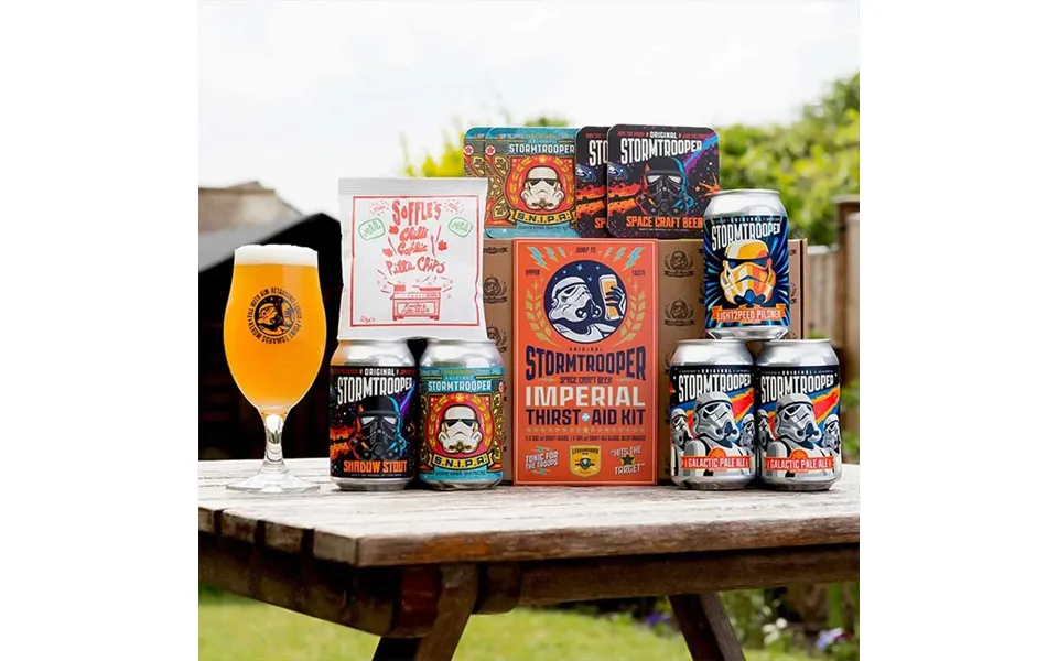 Not for sale to persons under the age of 18. Age verification checks will be performed during checkout. This item must be used responsibly and appropriately. You know, stormtroopers aren’t renowned for having good aim, but we’ll be darned if this stormtrooper imperial thirst aid kit doesn’t hit the spot a delicious stormtrooper pack, this beer kit is styled after the sci-fi armies. You get 5 cans of space craft beer, being snipa indian pale ale, two cans of galactic pale ale suitable for vegans , lightspeed pilsner, and shadow stout. You also get a 384ml ale glass with printing on the front and back, plus nucleation. Plus, you get some snacks to wash down with the beer. Oh, and four super cool stormtrooper coasters. So, if you know a sci-fi fan who loves downing beer as much as they love downing rebel ships, this stormtrooper imperial thirst aid kit is a must-have gift