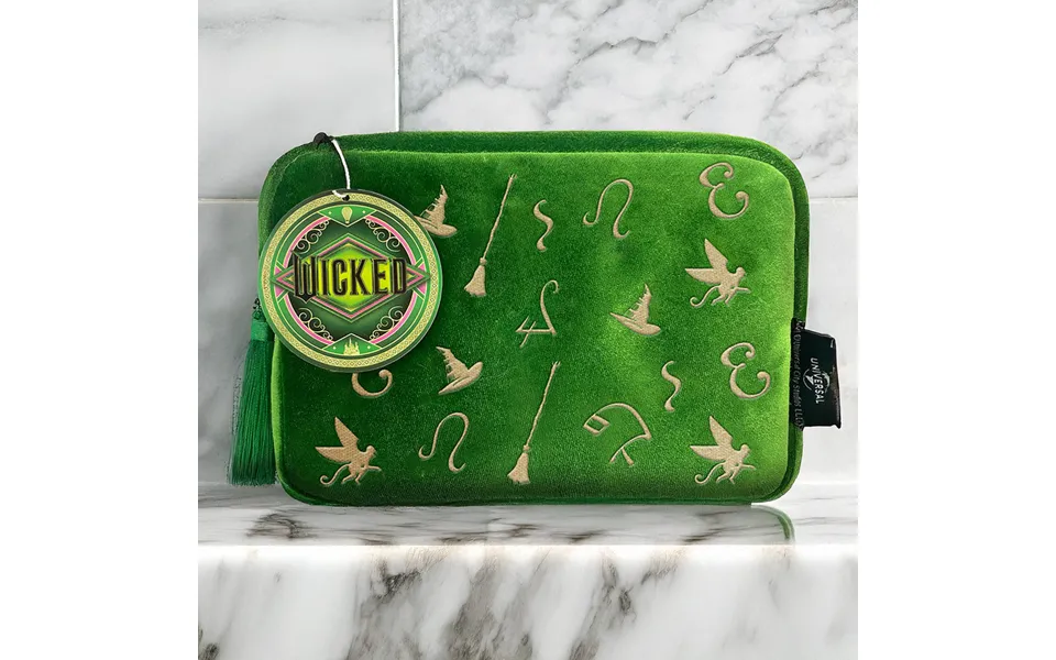 Embrace a touch of magic with the wicked elphaba cosmetic bag, designed to hold all your makeup essentials in style. Made from luxuriously soft velvet, this cosmetic bag features intricate embroidery of iconic witchy symbols in bright gold thread, perfectly capturing the mysterious charm of elphaba, the wicked witch of the west. Inside, the bag is lined with a sophisticated pattern showcasing the initial e for elphaba, offering a subtle yet distinctive detail for true fans. Ideal for daily use or for keeping your makeup organised while travelling, this bag is both practical and enchanting. Its compact size fits easily into handbags or luggage, while the cute green tassel adds a whimsical finishing touch. Whether you’re a devoted wicked enthusiast or simply love stylish, themed accessories, this cosmetic bag is sure to become a treasured part of your collection. Officially licensed wicked merchandise, this cosmetic bag is perfect for gifting or treating yourself. Add a sprinkle of witchy wonder to your beauty routine and enjoy a little everyday magic with this charming and durable cosmetic bag, made to last and delight.