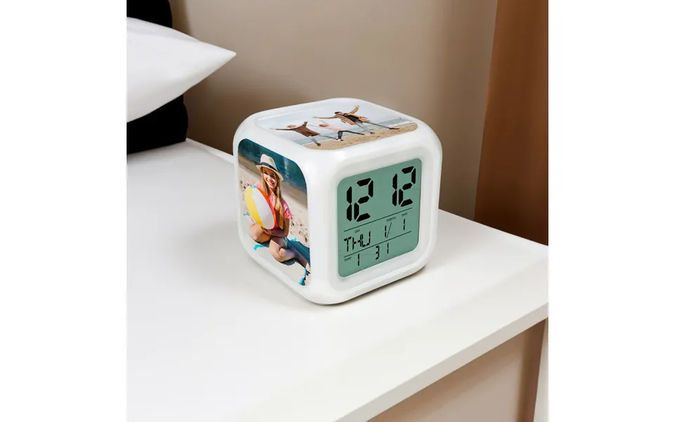 Experience mornings like never before with our personalised photo digital alarm clock, merging functionality with heartfelt memories. Awaken to the faces of your loved ones, printed on each side of the clock by our artisan creatives, offering the perfect motivation to rise and shine. With up to three cherished photos, every glance serves as a reminder of the special moments and people who make early mornings worth it. Featuring a large lcd screen and colour-changing lights, this alarm clock adds vibrancy to your bedside while offering practical functions like alarm, temperature, and date display. Choose from seven different colours to match your mood and start your day on a bright note. Whether it's a birthday, father's day, or christmas gift, our personalised alarm clock combines sentimentality with utility, ensuring each morning begins with warmth and love. Upload your highest-quality photos and let them transform your wake-up routine into a heartfelt experience. With every pixel, our alarm clock encapsulates the essence of your most treasured memories, making it the perfect addition to any bedside table. Personalisation: image one image two image three for best results, please follow the guidelines below: the image selected should be the high resolution, grainy photos may result in a poor end product ensure that the image selected is close-up with the entire head face clearly visible ensure that the head is 'face on' and not to the side please ensure you reference the ...