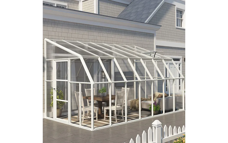 Extend your home and time in the garden with the 8x14 palram canopia rion white sun room&sol greenhouse 2.4M x 4.2M . More than just a lean-to greenhouse, this sun room makes an attractive conservatory for relaxation and leisure activities too. The choice is yours.This 8x14 sun room is expertly constructed from 4mm twin-wall polycarbonate roof panels and 3mm crystal-clear polycarbonate side panels, supported by a thick resin frame with reinforced central profiles and galvanised steel rods.The light-diffusing roof panels promote an even temperature by increasing thermal insulation and reducing extreme sunlight exposure. Both roof and side panels are completely uv-protected and shatterproof, and together they allow 82% light transmission. This means your plants will enjoy optimum growing conditions, you will be protected from harmful uv rays, and the panels will neither discolour nor fade in the sun.Snow-load tested to 75kg&sol m 15.4Lbs&sol ft , wind resistant to 90km&sol hr 56ml&sol hr , and with a lean-to roof which facilitates efficient rainwater runoff, this high-specification greenhouse will help your plants thrive, whatever nature throws at it.You can gain easy access through a single door, which can be fitted either end of the structure to suit the orientation of your garden. It includes a key-operated lock, so rest assured that your valuables will always be secure. A manually-opened roof vent helps you regulate the temperature, once inside.Backed by a reassuring 7-...