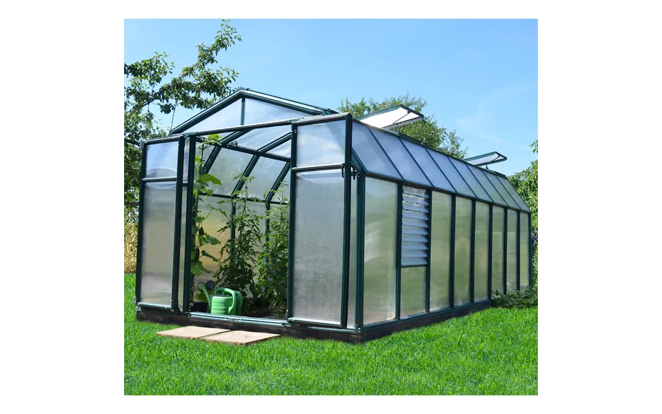 For hassle-free gardening and to help your plants thrive, choose the 8x16 palram canopia rion hobby gardener green greenhouse 2.66M x 5.16M . This large polycarbonate glasshouse can be assembled without tools and is built from high-specification materials which are completely maintenance-free.This 8x16 greenhouse is expertly constructed from 4mm twin-wall polycarbonate roof panels and 6mm twin-wall polycarbonate side panels, supported by a uv-protected, green resin frame with pin and lock connectors. Rubber sealing strips provide enhanced insulation, while a reinforcement cable ensures first-rate structural stability.The light-diffusing polycarbonate panels promote an even temperature by increasing thermal insulation and reducing extreme sunlight exposure. They are completely uv-protected and shatterproof, and together allow 82% light transmission. This means your plants will enjoy optimum growing conditions, you will be protected from harmful uv rays, and the panels will neither discolour nor fade in the sun.Snow-load tested to 75kg&sol m 15.4Lbs&sol ft and wind resistant to 90km&sol hr 56ml&sol hr , this high-specification greenhouse will help your plants thrive, whatever nature throws at it.You can gain easy access to the interior via wide double doors, which include a handle holder to keep them firmly in position when closed. Once inside, you'll find that the barn-shaped roof offers plenty of headroom, while 3 opening roof vents allow you to regulate the temperature f...