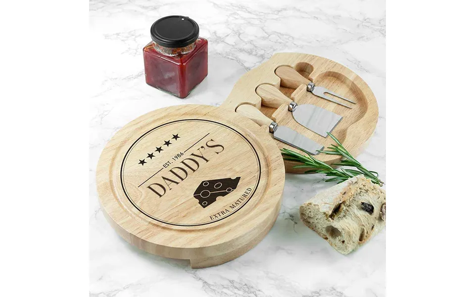 Referring to the cheese naturally you can also include a significant date such as the recipient's birthday, year he became a husband, father, grandfather..... The set includes two specialist cheese knives and one cheese fork with stainless steel blades and wooden handles. Not only is it a brilliant kitchen accessory, it also makes an aesthetically pleasing piece of tableware at dinner parties. Measuring 22cm across, it's large enough to host a gooey cambembert, slice of blue cheese and slab of mature cheddar or whatever you fancy . This personalised cheese board would also make a lovely christmas present for dad or grandad. Simply combine with some festive stilton cheese and a rich bottle of port. Mmmmmm. Perfect winter warmer and ideal holiday gift. Dimensions of board: 22cm x 22cm x 4cm. Dimensions of knives: 12cm x 3cm at handle personalisation: name 20 characters max. Year 4 characters max. Please note: this item will be personalised exactly as you...