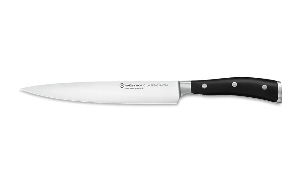 A carving knife is used to slice thin cuts of meat such as poultry, roasts, hams and other large cooked meats. The blade is thinner than a chef's knife for more precise slices of meat.Classic ikon knives feature a distinctive, double bolster design for professional-style heft, exceptional balance and beauty. The handle is made of a highly durable synthetic material polyoxymethylene pom which has a tighter molecular structure to resist fading and discoloration. The elegant shape of the handle is designed for a comfortable grip. The classic ikon 23cm carving knife has a longer and narrower blade than a cook’s knife. This allows for the knife to cleanly cut through meats. The pointed tip is designed to help guide meat away from the bone.Precision-forged from a single blank of high carbon stainless steelfull tang that is triple riveted to the handle for precise controlprecision edge technology petec yields a blade that is 20% sharper with twice the edge retention.Tempered to 58 rockwellthe half bolster allows for the knife to be honed and sharpened the entire length of the blade and the heel bolster provides added balancecomfortable contoured handle that is made of grenadill wood african blackwood wash by hand only