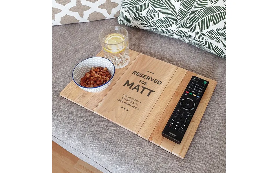 Up to 20 characters available per line fixed uppercase 'reserved for' is fixed text and cannot be changed about the product it's made from natural wood and has blocks on the outer edges which let it adapt to the thickness of your sofa's arm. Why you should buy it it's really handy for eating while watching telly, or maybe doing a bit of work from home. Plus, the personalised touch makes it super special personalisation: line 1 12 characters max. Line 2 20 characters max. Line 3 20 characters max. Line 4 20 characters max. Please note: this item will be personalised exactly as you have written so please double check spelling, punctuation and use of capital letters personalised products can only be returned if they are faulty do not include accents and special symbols as some of our processes will not allow this due to the font type used please do not use all capitals in your personalised message, or the personalisation will be very difficult to read