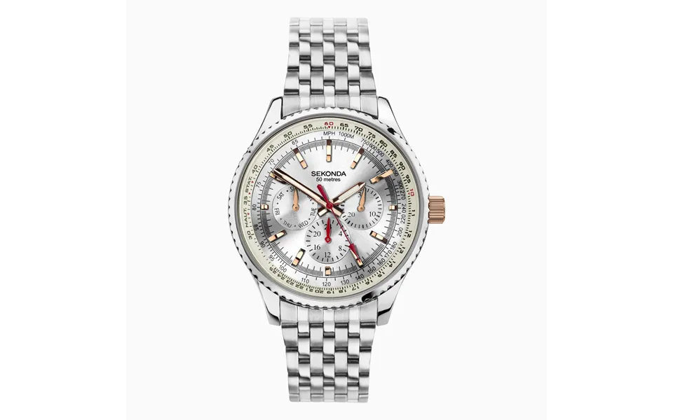 This watch has a round, silver ion-plated alloy case with a white chapter ring and a silver dial. Fastened with a stainless steel bracelet, features...show more