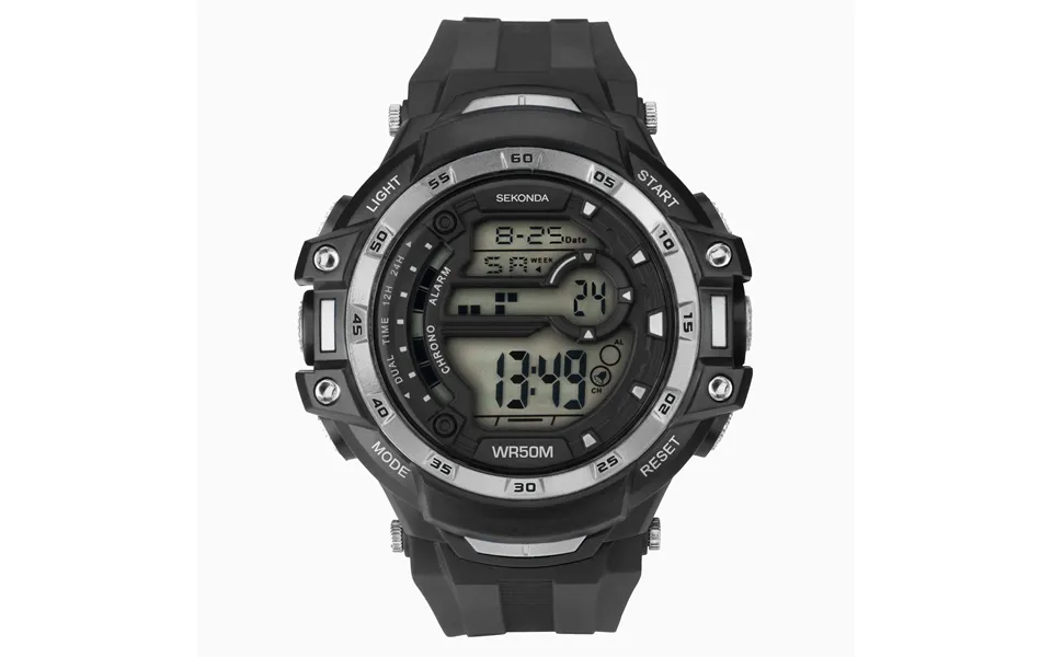 This sports watch features a black and silver coloured plastic case housing a black dial with white markings. The timepiece is fastened with a black...show more