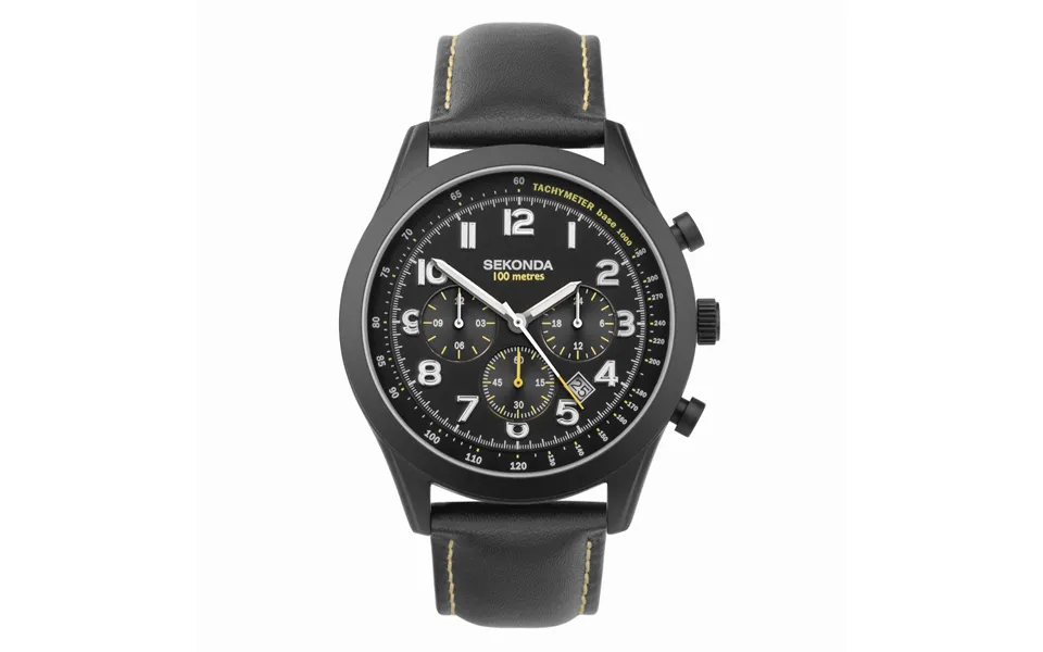 This dual time watch has a round, ion-plated black alloy case with a black dial, 24 hour sub dials, a tachymeter and a date display....show more