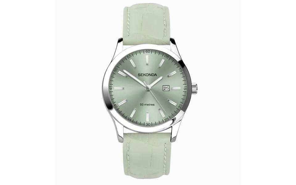 This watch features a round silver ion-plated alloy case with a light green sunray dial. Fastened with a light green, crocodile grain leather strap. This...show more