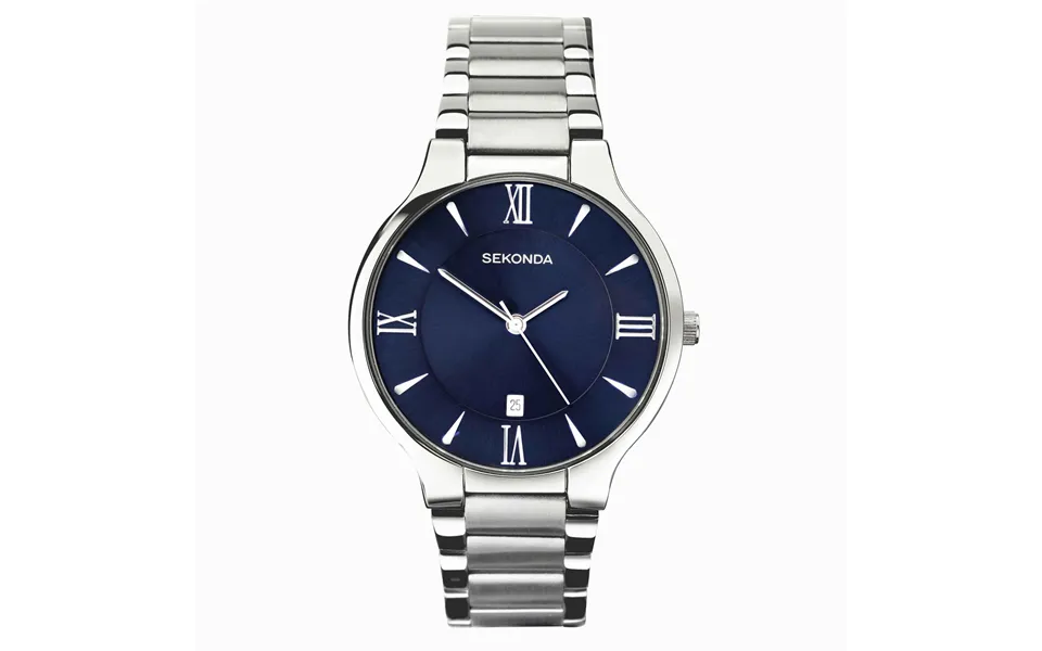 This watch has a round, silver ion-plated alloy case and has a blue sunray dial. Fastened with a stainless steel bracelet and has a date...show more
