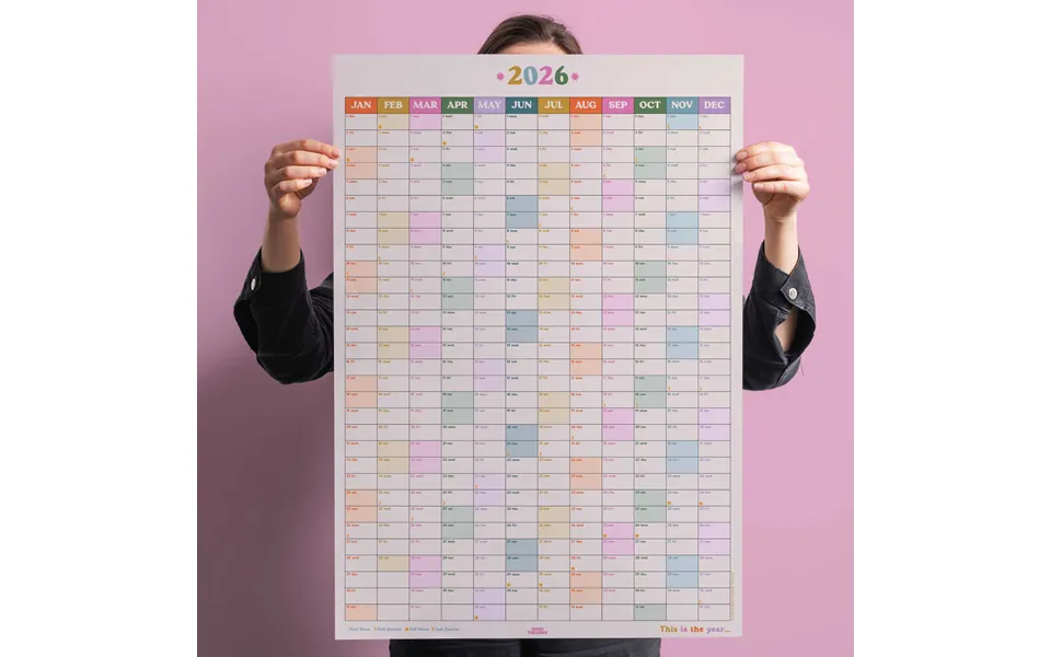 The best-selling yearly wall planner returns for 2026, with a fresh and vibrant colour palette that blends bright, fun shades with clean, modern typography. Designed to give you clarity for the whole year ahead, this planner offers a full overview of the year, making it easy to plan out all the important moments.. With weekends highlighted in soft pastel colours and moon phases included, it’s designed for optimal organisation. Whether you’re setting up your wfh space, planning family schedules, or office space, this wall planner is made to keep life on track.. Its compact portrait format is ideal for fitting behind doors, in kitchens, or above desks without taking up too much room. And don’t worry about ink bleed the sturdy paper is ready for sharpies.. And of course, as always, it’s printed in the uk on 100% recycled paper.. Special offer: it’s part of our buy one, get one half price offer on selected dated wall planners. See the full collection here.. Optional: add a pack of corner stickers to elevate your planning. Two sheets of 120 recycled paper stickers that fit perfectly in the corners of the date grid.. Product details:. Size: 49 x 70 cm 19.3 X 27.5 Inches. Size of individual date boxes: 3.8 X 1.9 Cm 1.5 X 0.75 Inches. 150Gsm paper