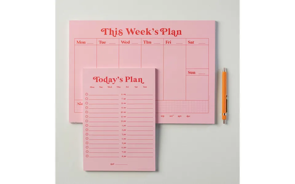 The joyful design will bring a touch of wes anderson design style to your desk vibe. Create a full week's plan and jot down the finer details in the daily planner.. The vertical layout, 52-page weekly planner pad is designed to help you stay organised. The simple layout is flexible and comes with a weekly overview and notes section. It can be used as a student planner, fitness planner, family organiser or for planning out your work week.. The daily planner pad combines your hourly schedule and to-do list, which helps you to be as productive as possible throughout the day.. Makes for a lovely, practical gift for anyone working from home, students or busy parents.. As always, printed on 100% recycled and recyclable paper.. It’s part of our pink & red wes anderson inspired collection - see it here . Product details. Set of 2 planner pads. 100Gsm paper which does not bleed . 100% Recycled and recyclable paper. Glued along top edge. Cardboard backing. Printed using vegetable based inks. Posted in plastic-free packaging. Designed and printed in the uk. Pen not included. A4 weekly planner pad pink & red. A4 size