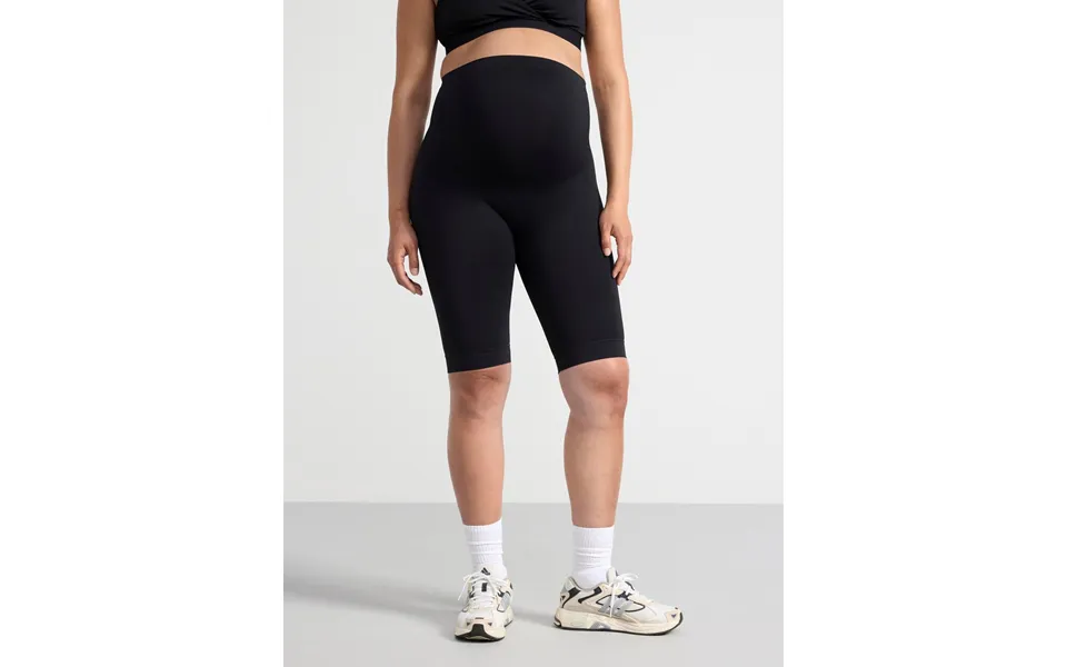 A pair of super comfy bike shorts with a seamless design and extra wide waist trim that fits around a growing belly.