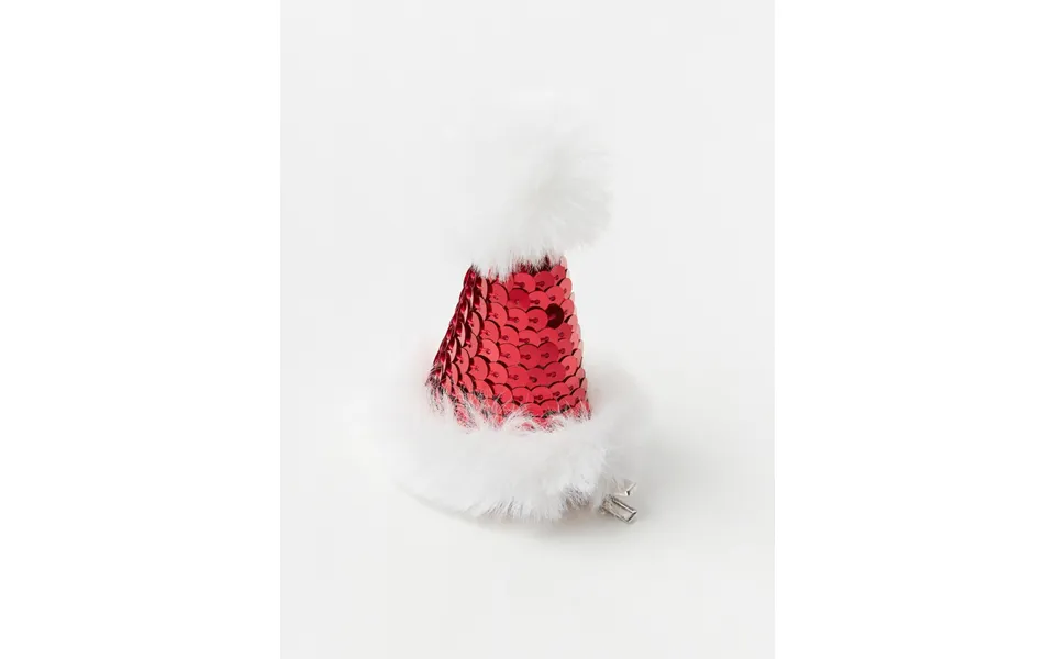 A sparkly sequin santa hat hair clip with fluffy trims and pompom.
