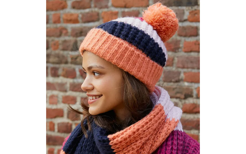 Chunky knit bobble beanie hat in stripe soft knit yarn in berry, peach and nav y fisherman rib british made wear as a set with...show more