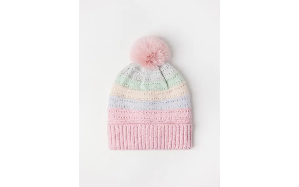 Soft rib knitted beanie with a faux fur pom pom and rainbow colours.