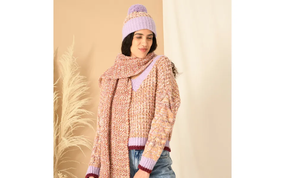 Chunky knit scarf in lilac and pink twist fisherman rib stitch soft knit yarn oversized length british made wear as a set with the lolly...show more
