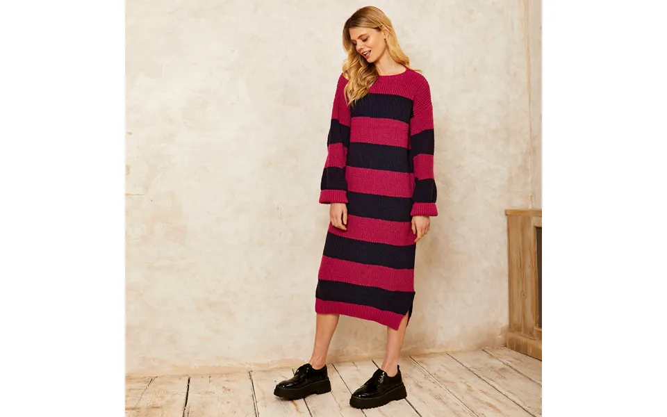 Bold and bright chunky stripes column midi dress side split detail at hem british made this style is oversized in shape. If you prefer a neater fit, you may want to try the size smaller in an oversized chunky stripe in fun bright tones, this is in a mid-weight fisherman rib knit with a super soft hand feel. The relaxed midi fit is super forgiving for all shapes, and the easy crew neck shows off your collar bone, flattering your neckline. With a relaxed straight sleeve with an added transfer rib detail, antonia also has a little side split to give it that extra movement. Effortless statement style, antonia will make you smile whilst keeping you comfy cosy all season long. Wear loose with slip on mules for a relaxed casual vibe, or cinch in with a waist belt & add biker boots for a tougher look. Designed in london and british made as part of our collection of knitted jumper dresses.