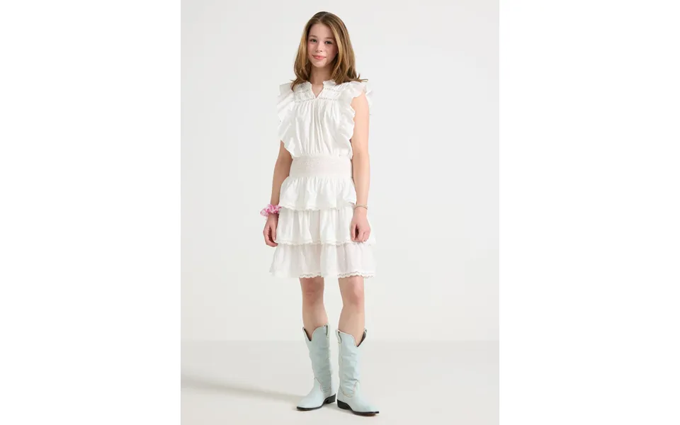 Woven dress in soft cotton with smocked waist, flounced skirt and lace details.