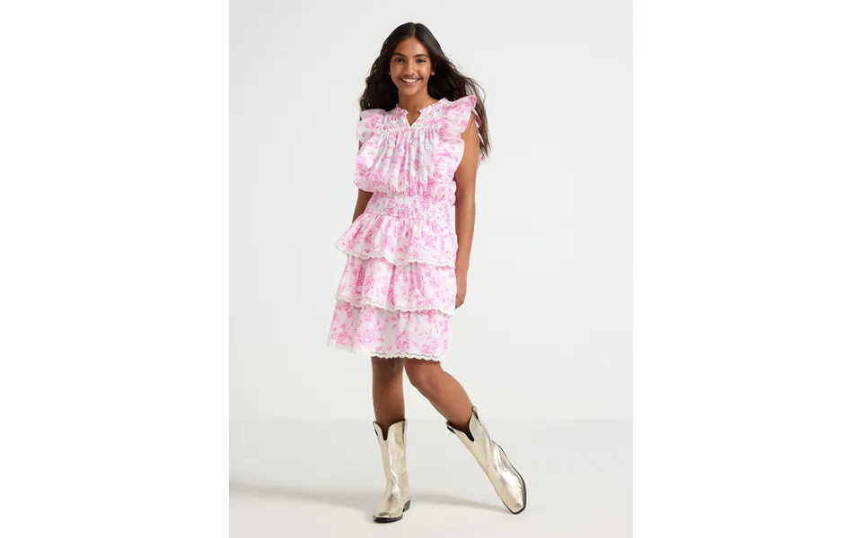 Woven dress in soft cotton with smocked waist, flounced skirt and lace details.