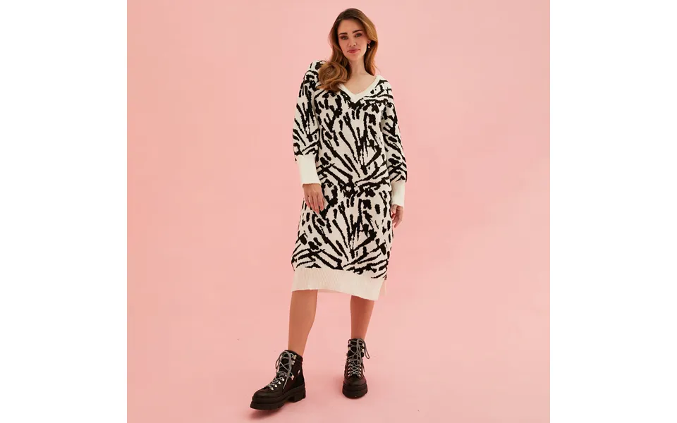 In a structured intarsia knit, made from vegan friendly yarns, elizabeth’s abstract brush stroke pattern catches the eye whilst remaining timeless. With a deep v-neck to balance out the voluminous balloon sleeves, this midi has an added side split to give movement to the shape. Style with knee high heeled boots for that date night look or slip-on mules for easy transitional dressing. For more options see our jumper dress designs.