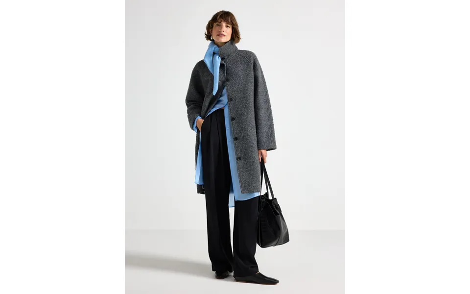 Coat in wool blend with structure, featuring stand collar, button closure and pockets to front.