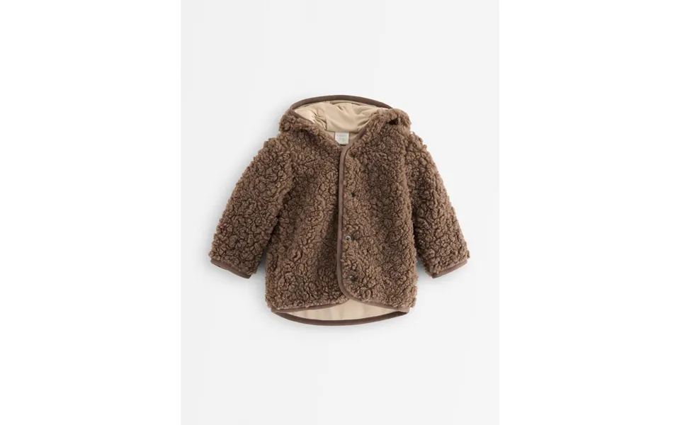 Cosy pile jacket featuring a jersey lining, buttons, and a hood for added warmth.