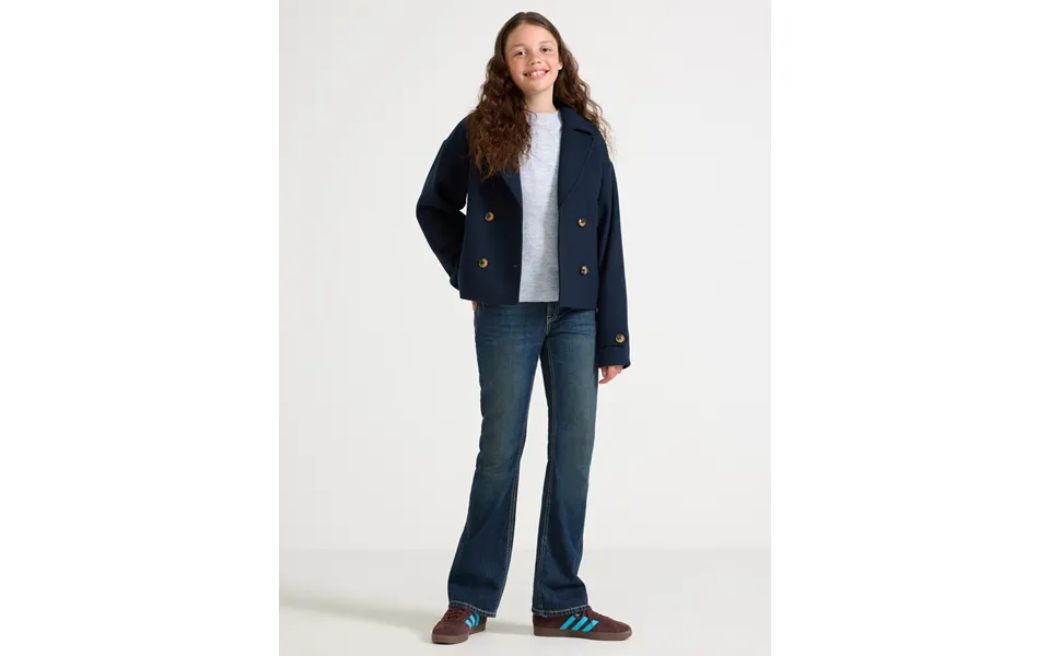 Short trenchcoat with double buttoning, classic collar and side pockets.