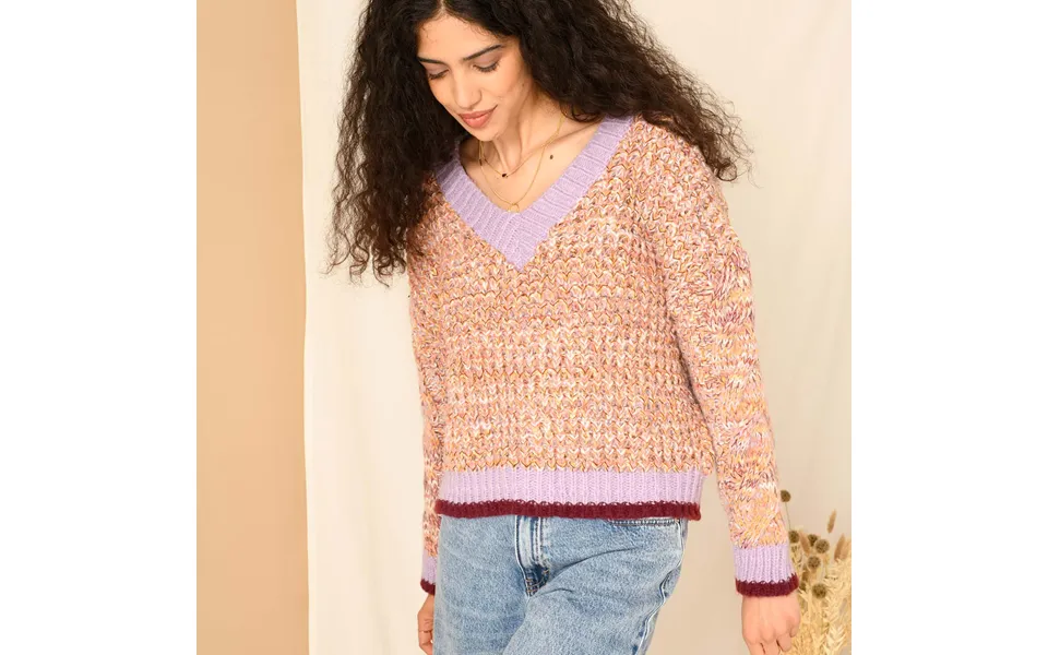 Chunky v-neck jumper in pink and lilac twist soft cable knit in a basket stitch contrast trims boxy oversized fit british made wear as a set with the florence scarf & the lolly bobble hat the amy v-neck jumper in a chunky basket stitch is full of rusts, pinks and lilacs. With a pretty pastel trim with a fun burgundy tipping, amy has a contrast moss stitch with cable detail on the sleeve. Playing into this springs pastel trend , this women's knitted cable knit jumper is a perfect for lounging at home in style or layering up cosy warm for the winter dress amy up or down with blouses and tailored trousers or slouchy denim. Due to the nature of the knit, each garment will look slightly different making it completely unique just for you all of our colourful knitwear including these knitted jumpers is made in the uk from vegan-friendly yarns.