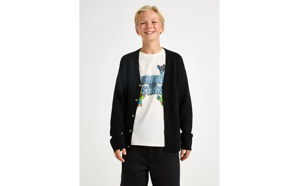 Knitted cardigan with v-neck and button closure.