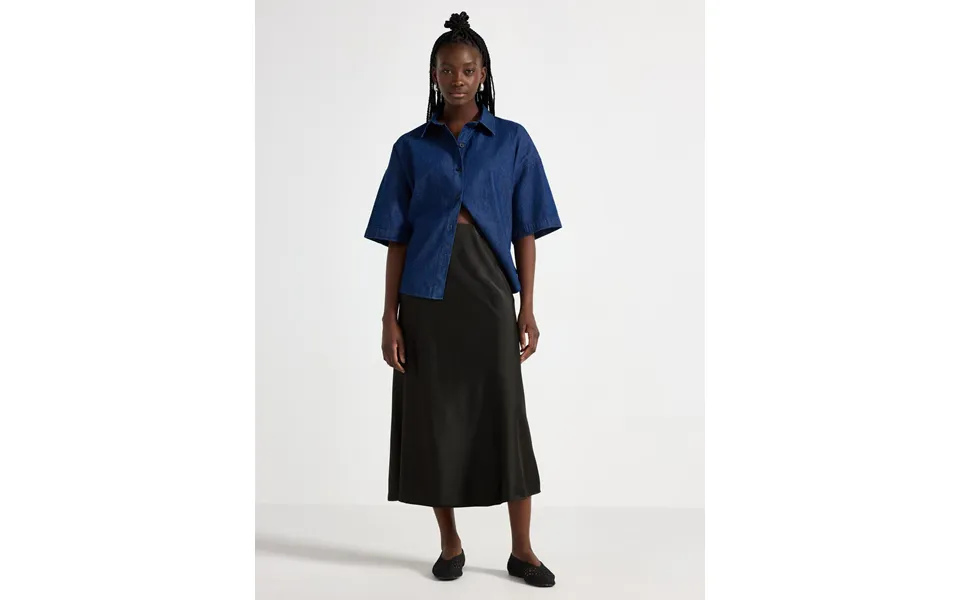 Sleek midi skirt with a slightly flared silhouette and a shiny satin finish.
