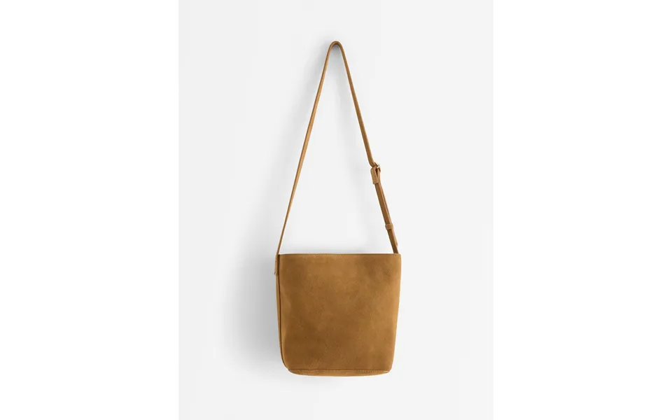 Suede bag featuring a magnetic fastener and an adjustable shoulder strap.