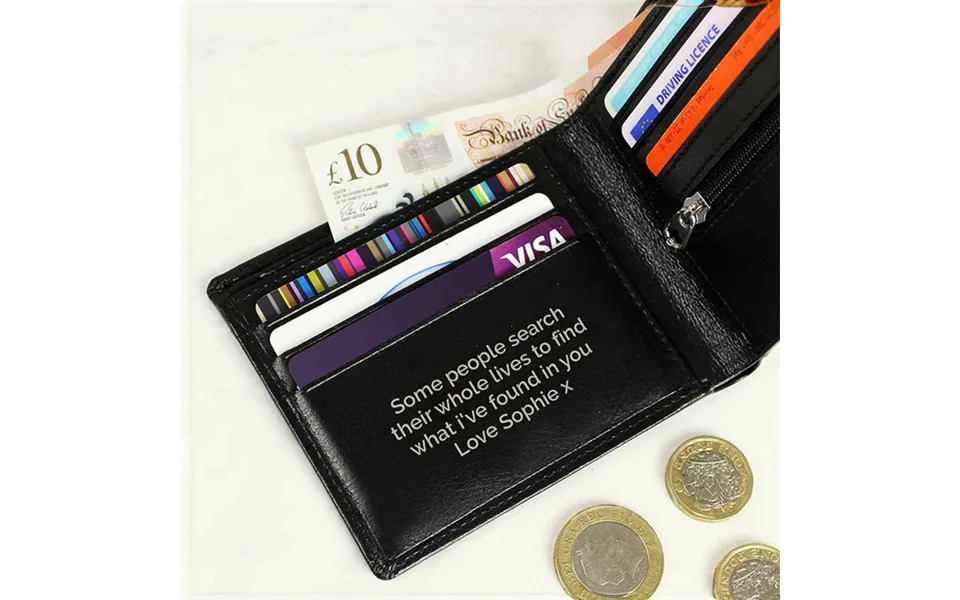 Want to give a gift that says just how you feel well, you can’t do better than this personalised black leather wallet, which can literally say how you feel yep, you get four lines of personalisation to pour out your heart. And, with up to 25 characters per line, you can really say what you mean. The text will be printed exactly as you type it, but please don't include any special characters or emojis. The personalisation will be printed on the inside of the leather wallet. And, speaking of the wallet itself, that has 6 card slots, a note slot, and a zip-up coin pocket. This wallet makes a great gift for birthdays, father’s day, mother’s day, anniversaries, and so much more personalisation: line 1 25 characters max. Line 2 25 characters max. Line 3 25 characters max. Line 4 25 characters max. Please note: this item will be personalised exactly as you have written so please double check spelling, punctuation and use of capital letters personalised products can only be returned if they are faulty do not include accents and special symbols as some of our processes will not allow this due to the font type used please do not use all capitals in your personalised message, or the personalisation will be very difficult to read