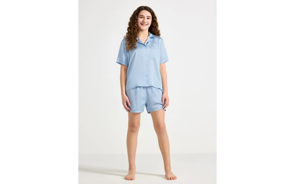 Pyjama set in soft satin with short-sleeved shirt and matching shorts.